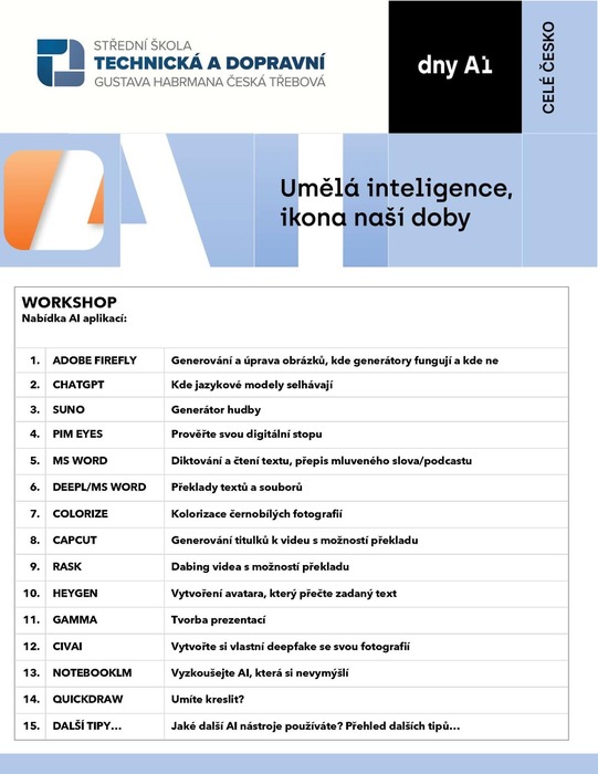 Dne 5. listopadu 2025 proběhla na naší škole akce „Dny AI“, kterou jsme uspořádali jako prakticky zaměřený workshop věnovaný moderním nástrojům umělé inteligence.